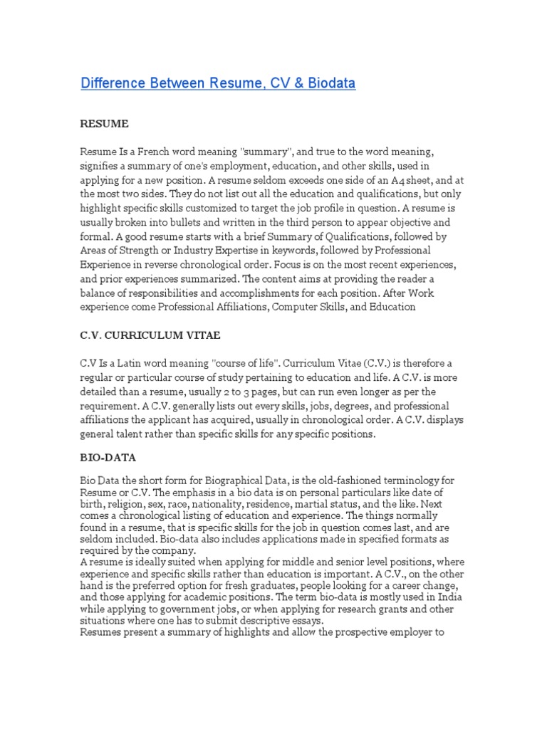 Difference Between Cv And Resume And Biodata / Difference Between Cv And Resume With Comparison Chart Key Differences. In most of the countries, while the course of employment, cv or a resume. Difference between cv, resume and biodata curriculum vitae cv or curriculum vitae is the detailed information about you, i.e. Resumes are typically one to two pages while cvs have no length restrictions but are typically between three and ten pages. Difference between resume and cv and biodata. Parents so on and so forth.